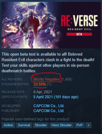 As you can see in the above image, the Re:Verse BETA received “Mostly Negative” reviews on Steam and a 33.55% SteamDB rating. Now although the BETA was review bombed to some extent by some fans that want a Resident Evil Outbreak remake, it’s still a pretty bad rating.